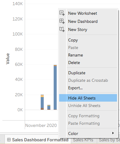 By default, Tableau shows all worksheets as tabs along the bottom of the screen. While this is useful when building, it can make the workbook feel a bit messy when you’re presenting or sharing it.
