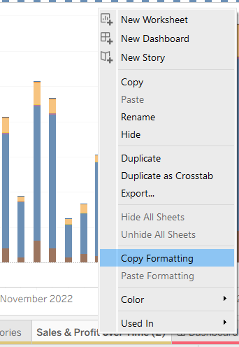 You can copy formatting from one worksheet and apply it to another. If you right-click on the sheet tab that already has the formatting you want, you’ll see an option to copy formatting. You can then go to another sheet, right-click, and paste that formatting to copy it to the selected worksheet.