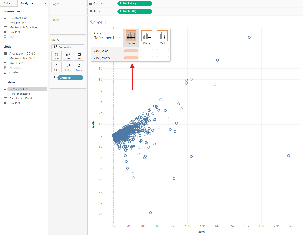 • Add one reference line for SUM(Sales) and one for SUM(Profit)