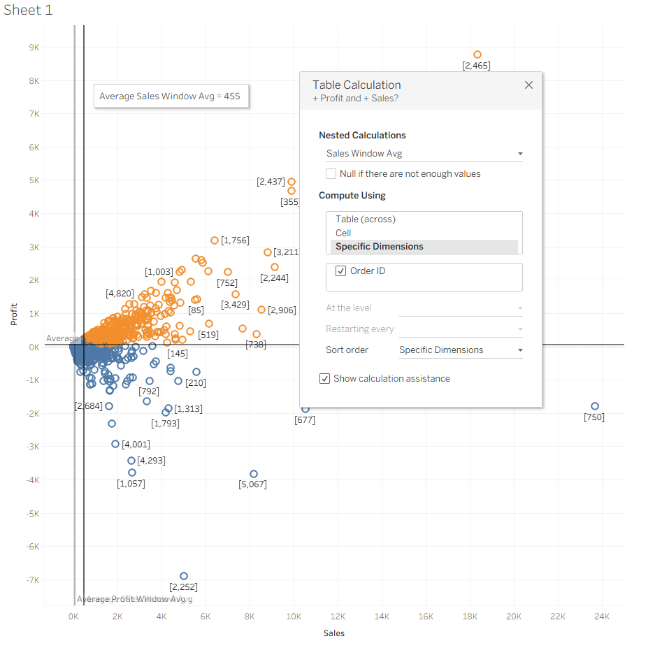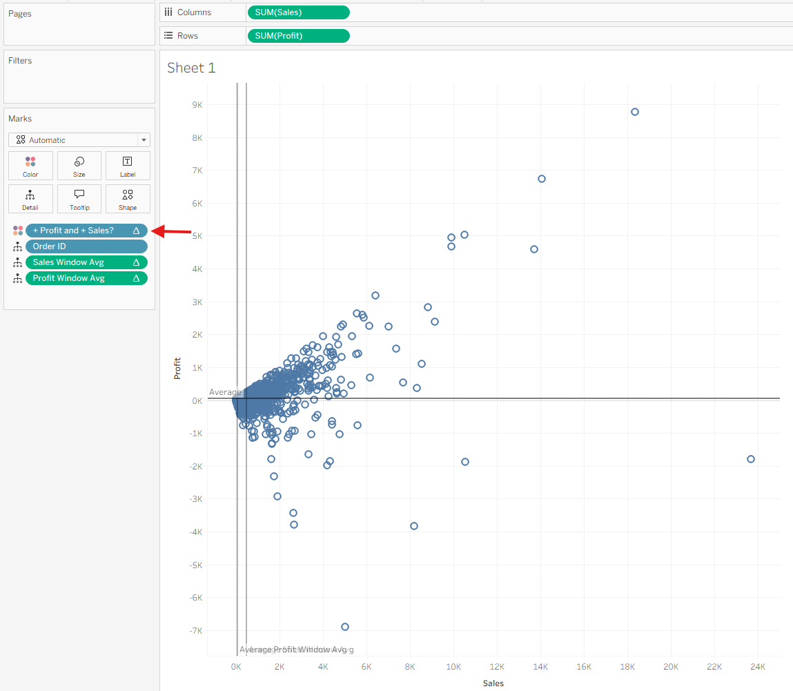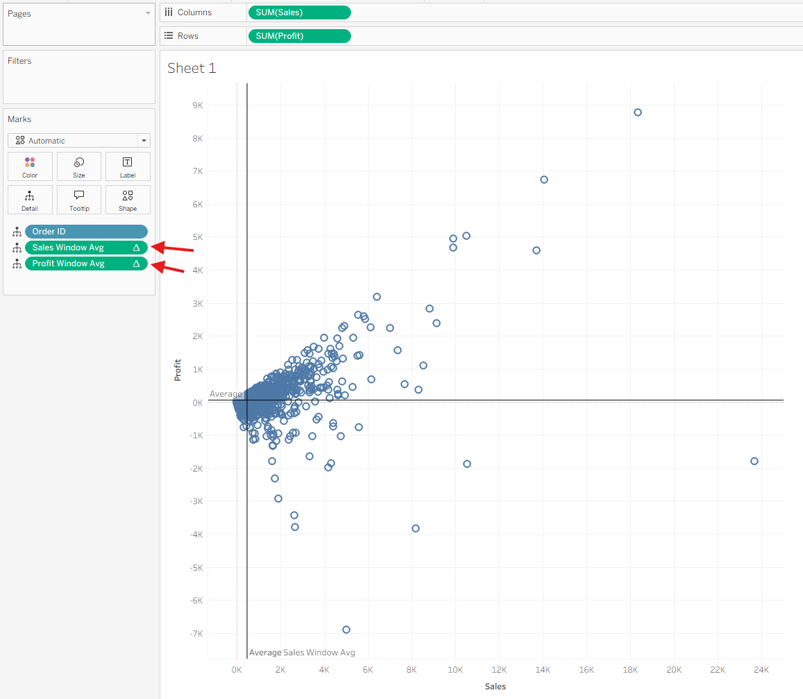 In this walkthrough, we’ll create a scatter plot that highlights quadrants based on the average Sales and average Profit using window average table calculations. This is a great way to quickly identify high-performing and low-performing marks relative to the overall dataset.