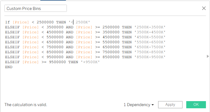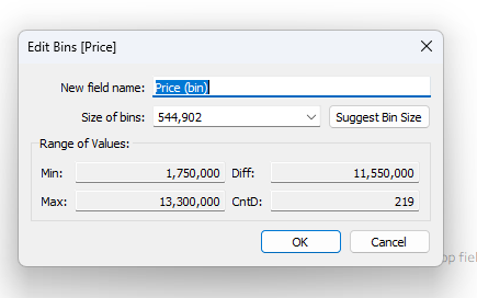 Even with dynamic bins, you might still want more control. Tableau’s default bins only display the lower end of each range, while custom bins let you display the full range. If your dataset is heavily skewed—or if you want to define specific price ranges—creating custom bins with a calculated field is the better approach. In this example, we’ll group housing prices into sets of 1,000,000, covering a range from 2,500,000 to 9,500,000.