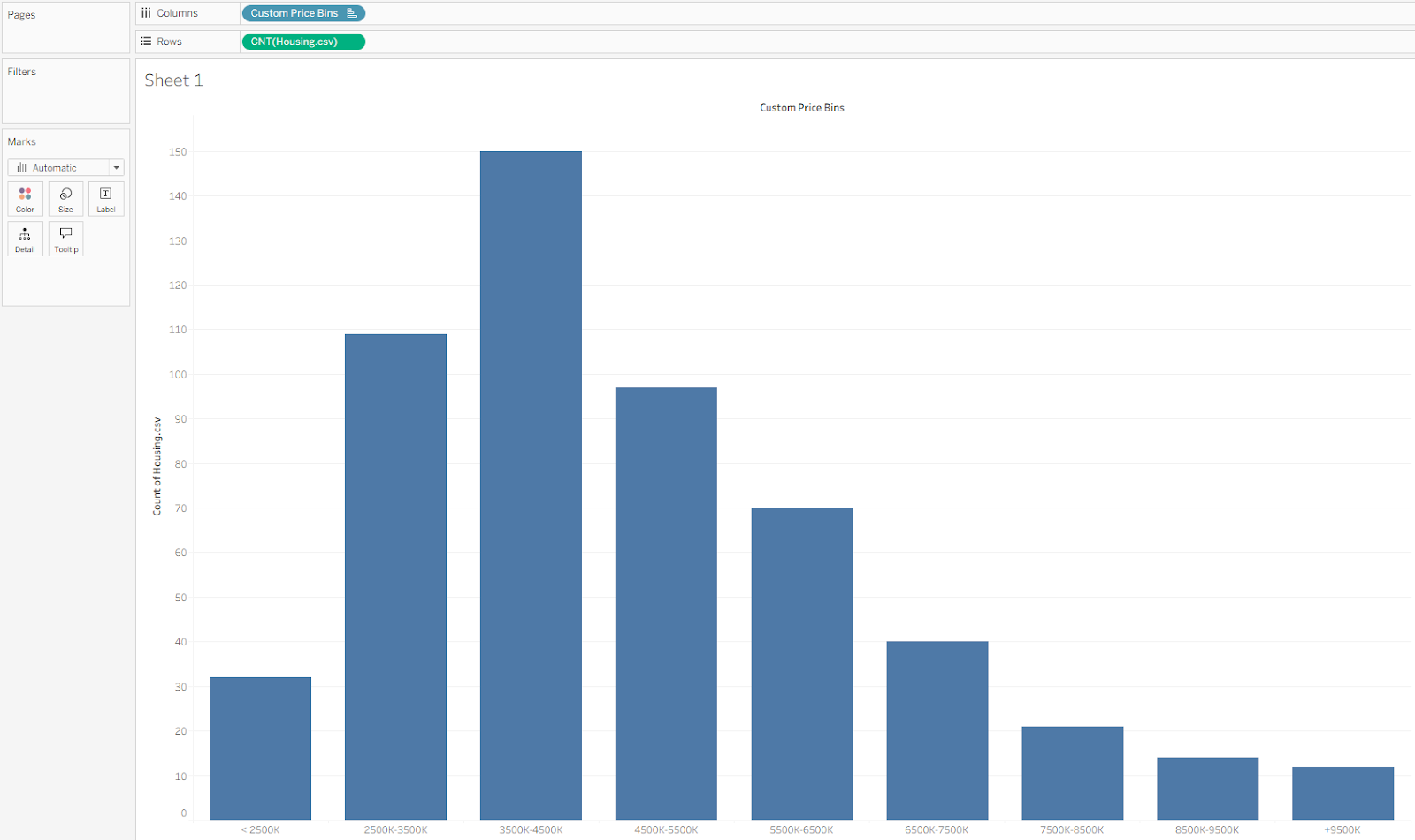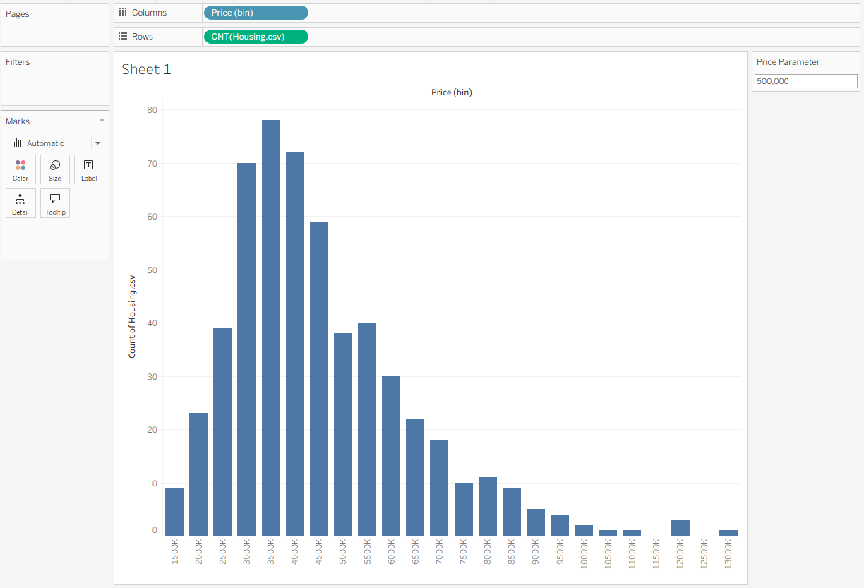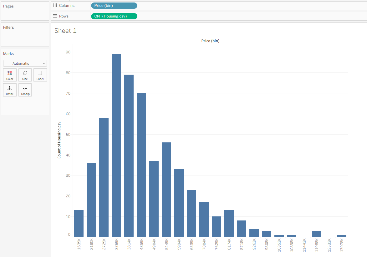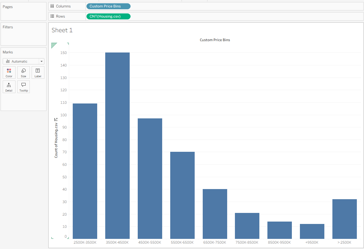 This creates a new blue pill in the Data pane called Price (bin), marked with a small blue histogram icon. Drag this pill to Columns to create your bins, then drag Housing.csv (Count) to Rows. This plots the number of houses within each price range.