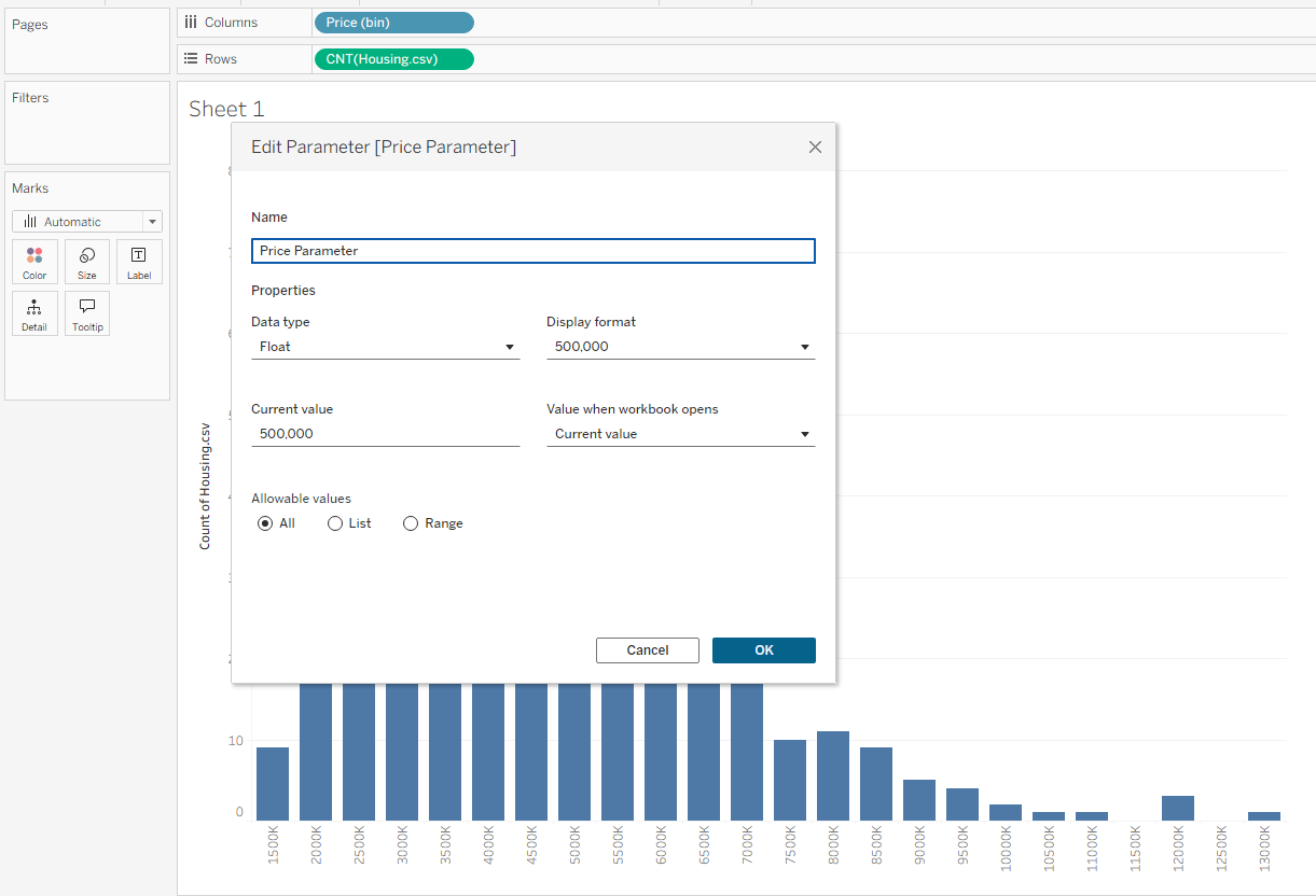 This opens a Create Parameter window. Name your parameter Price Parameter, set a default value (here, we’ll use 500,000), and change Allowable Values from Range to All. This makes your parameter more flexible and future-proof, especially if your dataset later includes a wider range of prices.