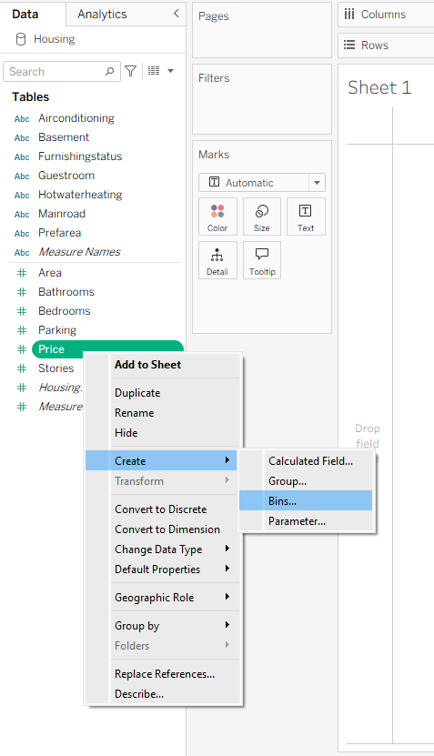 Let’s say you want to group houses into bins based on their price to get a clearer picture of the price distribution. To do this, right-click the Price pill, hover over Create, and then select Bins from the menu.