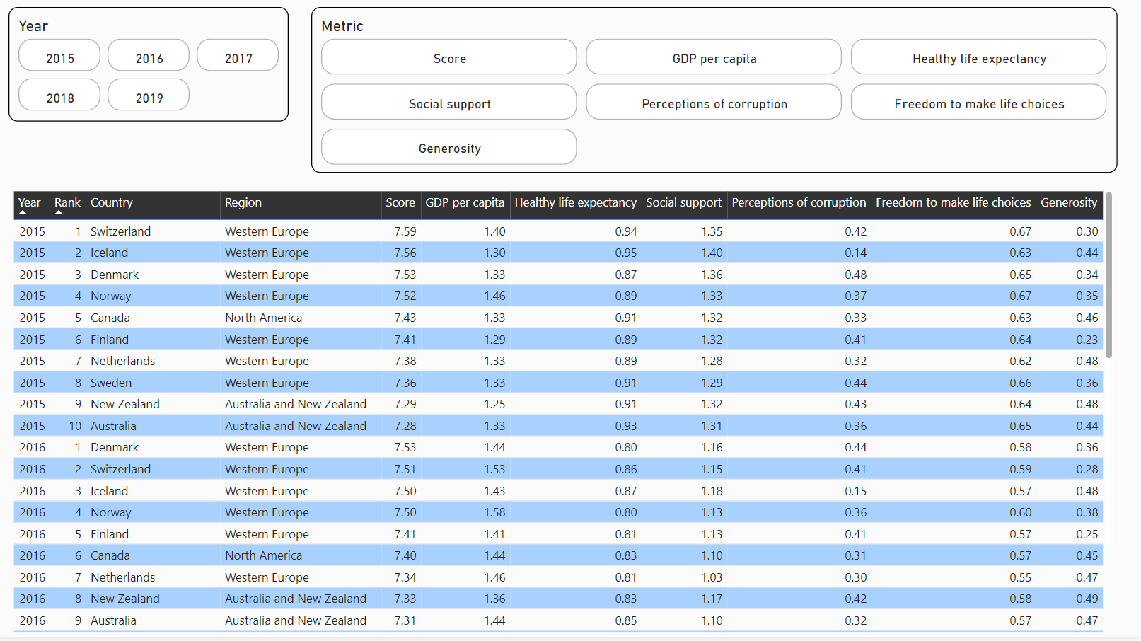 Zuerst erstellte ich eine Tabelle mit allen Faktoren, die den Glücklichkeitswert beeinflussen, und fügte zwei Filter hinzu, einmal für das Jahr und dann für die Metriken. Die Idee dahinter war, dass der Benutzer die Daten zuerst verstehen konnte, bevor das Ergebnis sichtbar wurde.
