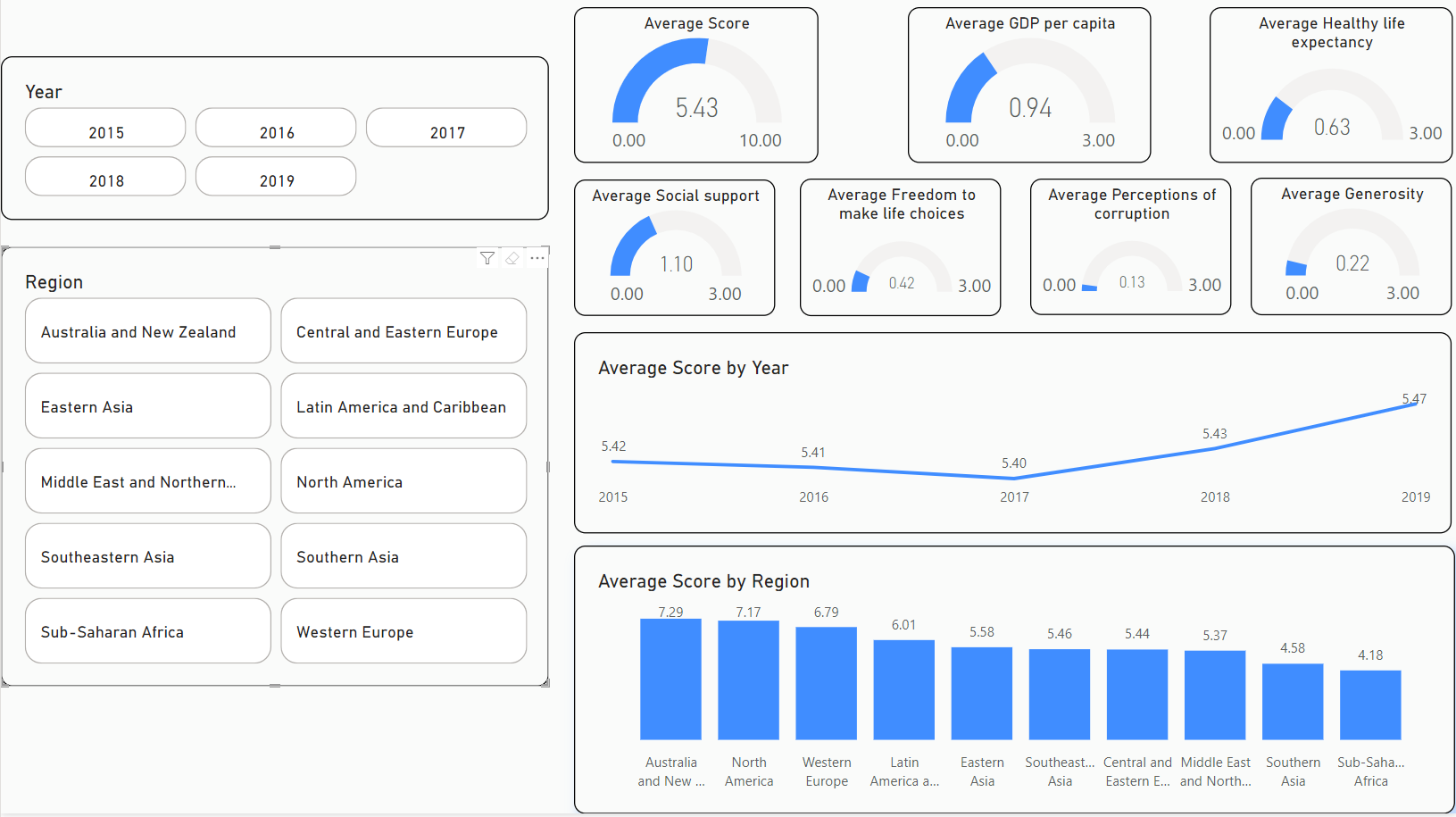 Tag 2 der Dashboard Week hat uns die Gelegenheit gegeben, wieder mit Power BI zu arbeiten. Die Datenquelle war ein Datensatz von Kaggle, der das Glücksempfinden der Menschen in allen Ländern der Welt anhand der GWP (Gallup World Poll) gemessen hat. Wir mussten alles in Power BI erledigen, einschließlich der Datenvorbereitung, und das stellte sich als größere Herausforderung heraus als erwartet.