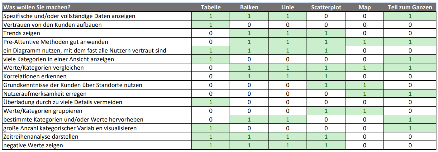 Schaut man an die Werte der Tabelle, dann findet man entweder die Nullen oder die Einsen. Null bedeutet nein, eins bedeutet ja. Also wenn es "eins" steht bei der Kategorie "spezifische und/oder vollständige Daten anzeigen", dann bedeutet das, dass diese Diagrammart geeignet für diesen Zweck ist. Oft wollen wir einen Trend zeigen, beispielsweise. Um ihn zu zeigen, können wir nicht die Tabelle anwenden, sondern eher Balkendiagramm oder Liniendiagramm. Möchte man nicht nur positive, sondern auch negative Werte zeigen, dann sind "Map" und "Teil zum Ganzen" nicht die beste Wahl dafür. Möchte man aber die Prozentzahlen einer Variable im Vergleich zu den anderen Variablen, dann ist "Teil zum Ganzen" sehr gut geeignet. Sucht man die Korrelation zwischen den Variablen, dann passen Balken, Linie und/oder Scatterplot zu den Aufgaben ganz gut.