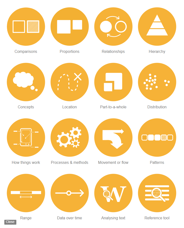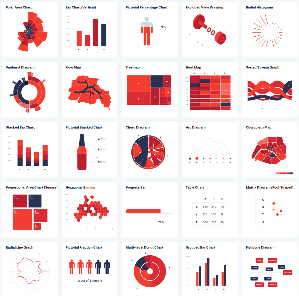 Hier werden die Zwecke der Visualisierung als Entscheidungsparameter angewendet: ob man einen Vergleich, eine Proportionalität, Beziehung zwischen zwei (oder mehr) Variablen, Hierarchie, Standorte, Datendistribution, Prozesse usw. zeigen möchte. Schauen Sie an die Auswahl, die in dieser Website definiert sind.