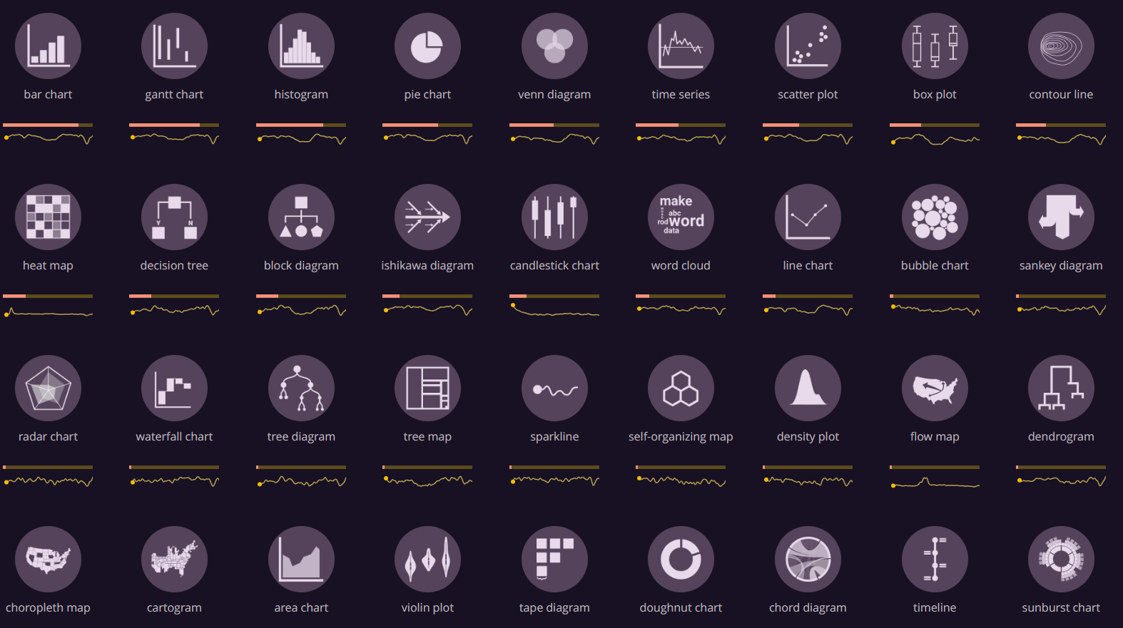 Beim Unterricht wurden die Diagramme in sechs Diagrammarten untergegliedert. Es sind bestimmt noch mehr Diagrammarten, aber wir haben in der zweiten Woche mehr über diese sechs Diagrammgruppen diskutiert. Es sind: Tabelle, Balken, Linien, Scatterplot, Karte und Teil zum Ganzen.