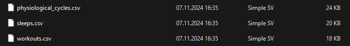 I have now worn a Whoop, which is a fitness tracker that is ment to be worn 24/7, for more than 5 months. This means I've already collected plenty of data to start with about my sleep, physiological health and workout frequencies and intensities. Conviniently my fitness tracker has a export data button in the iOS app and can send me all my data spread out to 3 comma seperated files via e-mail.