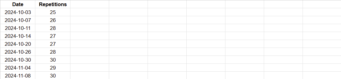 Additionally I wanted to add just one more table that I've set up myself and keep up to date manually. I created a google spreadsheet to keep track of how many pull ups I did on specific days, where I chose to do them, because I've nothing else exercise related planned. I created this spreadsheet to monitor my progress on pull ups and was sure that displaying them on this dashboard would be a nice addition.