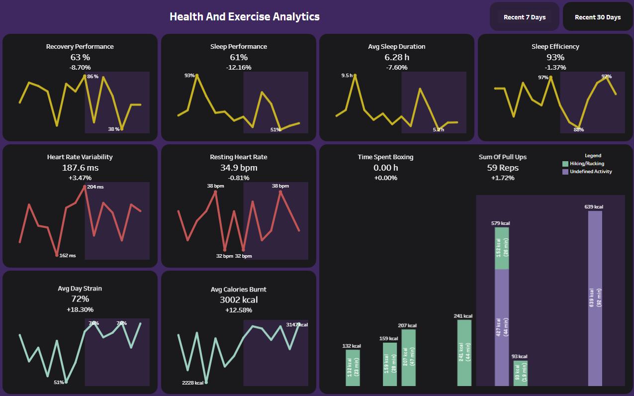 The end result was a first version of a dashboard I’ll use frequently in the future to ensure my training is on the right track so I can win my first boxing fight in 2025. One disclaimer: In the "Time Spent Boxing" KPI, you can see that I didn’t include it in the following screenshot. This was due to not bringing the necessary hip mount to the training sessions, resulting in lost data. However, with this dashboard in place, I’ll make sure to track these workouts in the future.