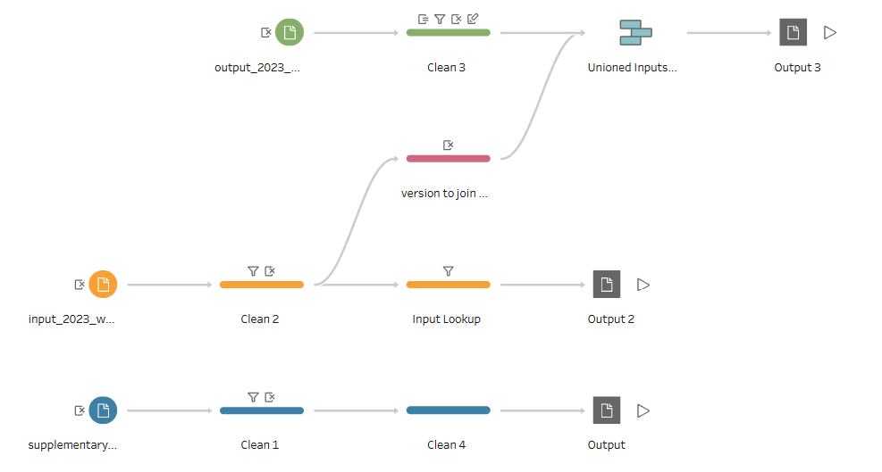 I did some data prep in order to union together the input (before the ball is thrown) frames and user positions, and the outputs (after the ball is thrown). I also kept the input table separately as another lookup table as it had information about the players, and also the supplementary table with minor cleaning. I then related the two lookup tables to the unioned input and output data.