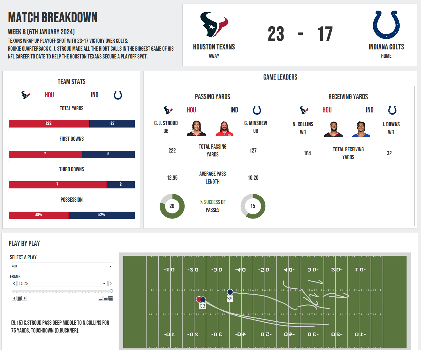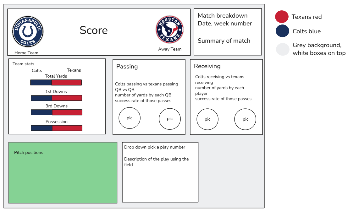 A major challenge for this project for me was the subject. I had absolutely no knowledge on American football and it made understanding the dataset tough, as well as coming up with any kind of angle to take for the final dashboard. I decided to keep it simple and realistic of what I would be able to understand under time restraints. I went for creating a match breakdown, and spent a lot of time talking to a football fan understanding what they would want to see after a match has taken place. I took a lot of inspiration from the ESPN match reports and designed a sketch for a breakdown of the Houston Texans vs. Indiana Colts match.