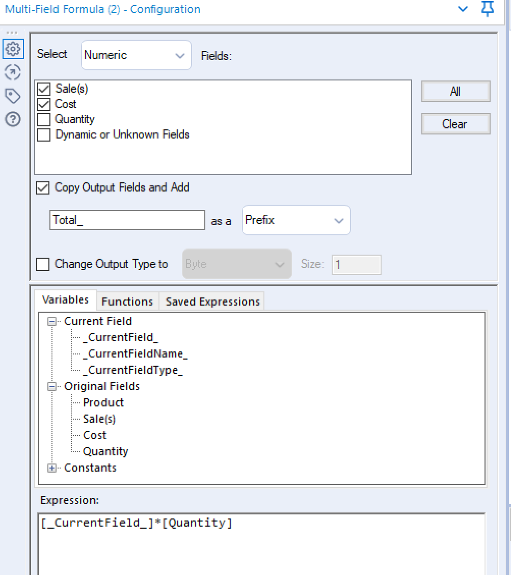 First we select our desired current fields as 'Sale(s)' and 'Cost' so we can use them in our Multi-Field Formula. Next we have select 'Copy Output Fields and Add' to create a new set of fields with the prefix 'Total_'.
