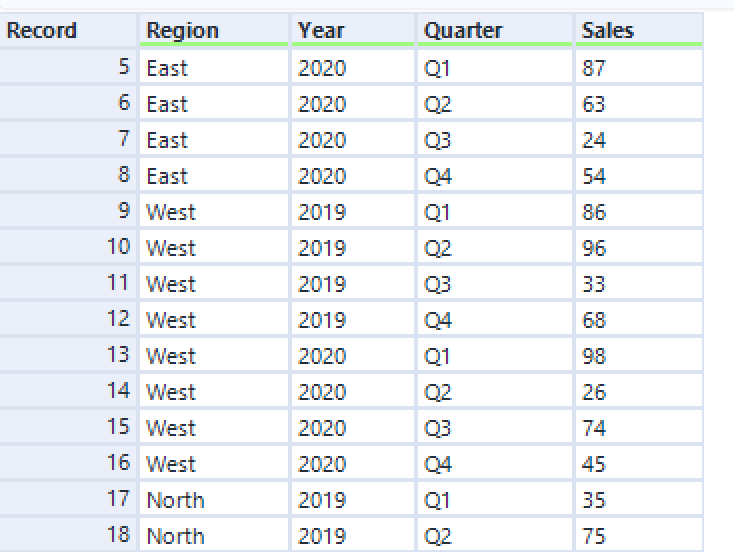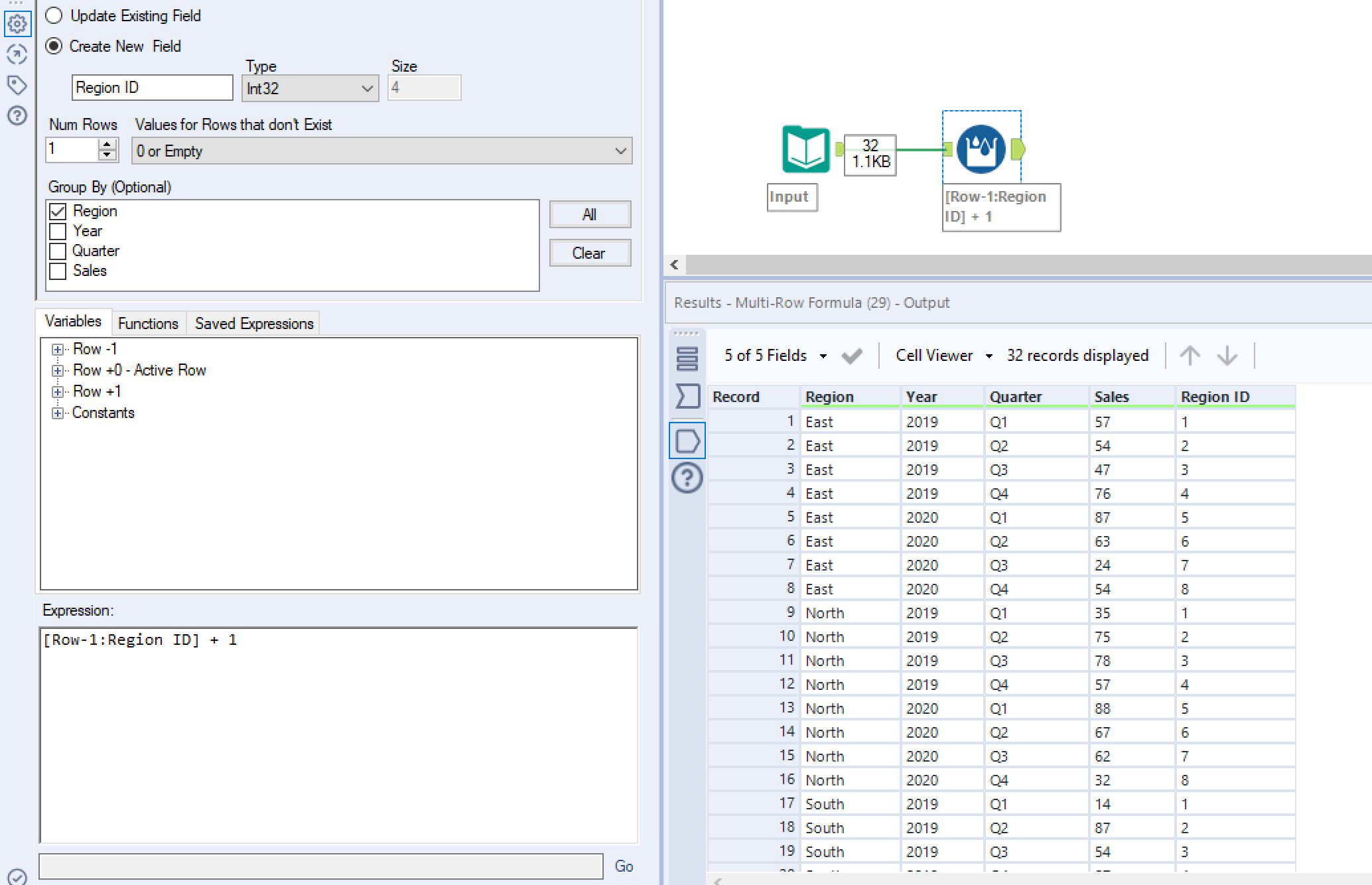 The Multi-Row Formula instead works between rows and although limited to an individual column, we have more flexibility in the expressions we can create. In this example we want to create a 'Region ID' for each 'Year' & 'Quarter'