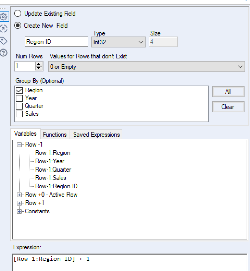 Again, we will be creating a new field with this calculation and so the 'Create New Field' is selected. Group by 'Region' is selected to apply our following expression to each set of Regions independently. We can create our expression [Row-1:Region ID] + 1, again this can be added by using the variables tab. This equation calls upon the row before in our new column (Row-1) and adds 1 to create the next number in our 'Region ID'.