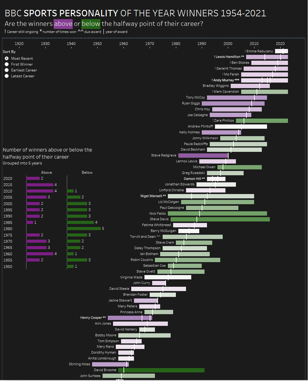 Welcome back to my series of dashboard week blogs. Today we were tasked with choosing from a selection of Tableau dashboards with the goal of recreating them in Power BI. I chose a gantt representation of BBC sports personality of the year winners and their respective career lengths by Lorna Brown.