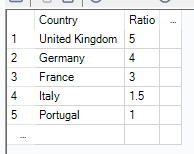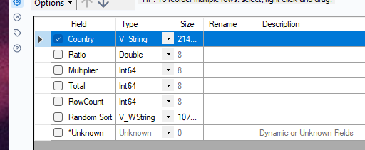 In the Country column I have added five countries and in my Ratio column I have created the ratio of records/rows I would like between those countries i.e. my distribution. In the flow, name this input "RATIO".