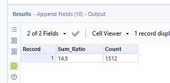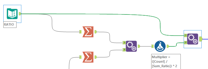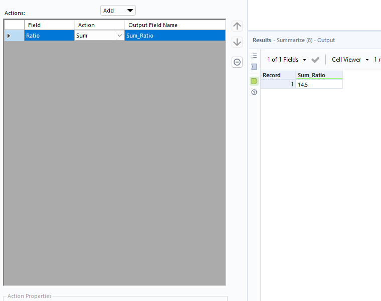 Next: Use a Summarize tool to sum up the ratio column for use in calculations further down the flow. In this case our sum of ratios is 14.5.