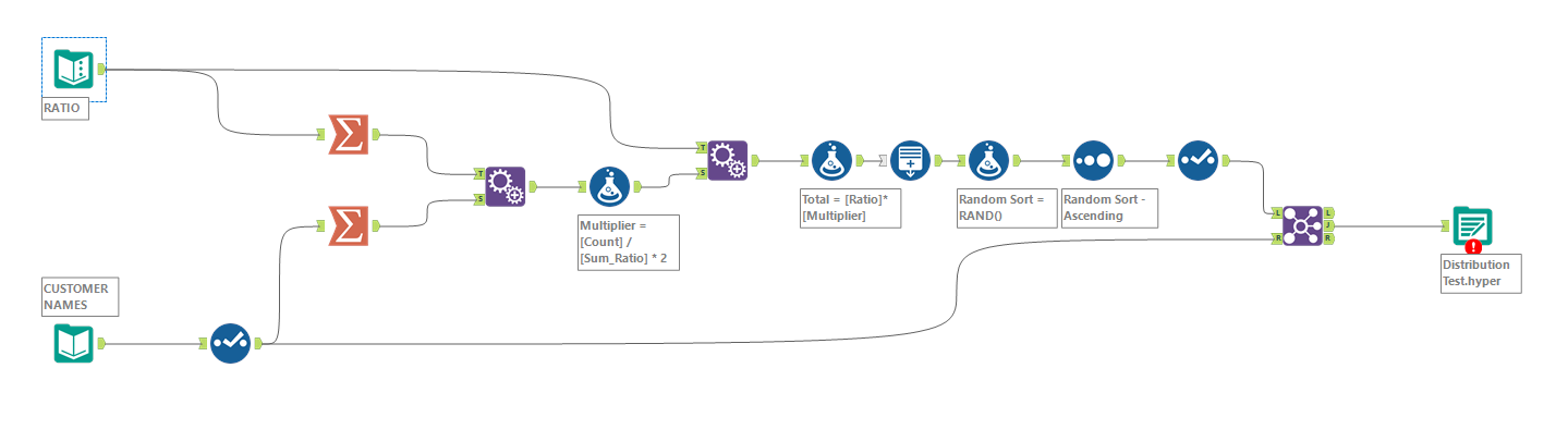 After this step we should just have 2 separate inputs in the flow: "CUSTOMER NAMES" and "RATIO" plus any Select tools used for data cleansing.