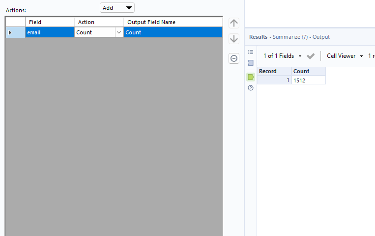 We then want to attach a Summarize tool to our customer names table and count the unique identifier row (in this case email) as below: