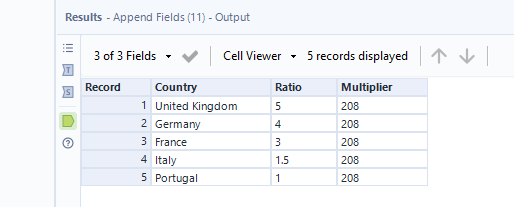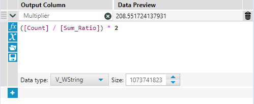 Add a Formula tool after the append tool and divide the Count by the Sum_Ratio before multiplying that formula by 2. Multiplying by 2 allows for a little more variation in our distribution as well as ensuring we have an excess of country data to connect to the customer data, preventing any nulls. Name the new column "Multiplier".