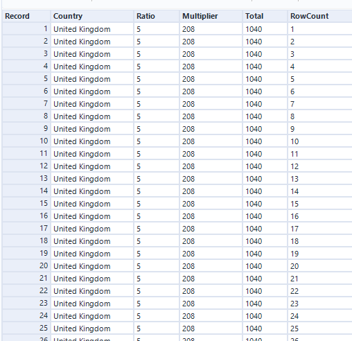 Have a quick scroll to check that each country has an equal number of rows to the number stated in Total, in this case 1040 rows for United Kingdom.