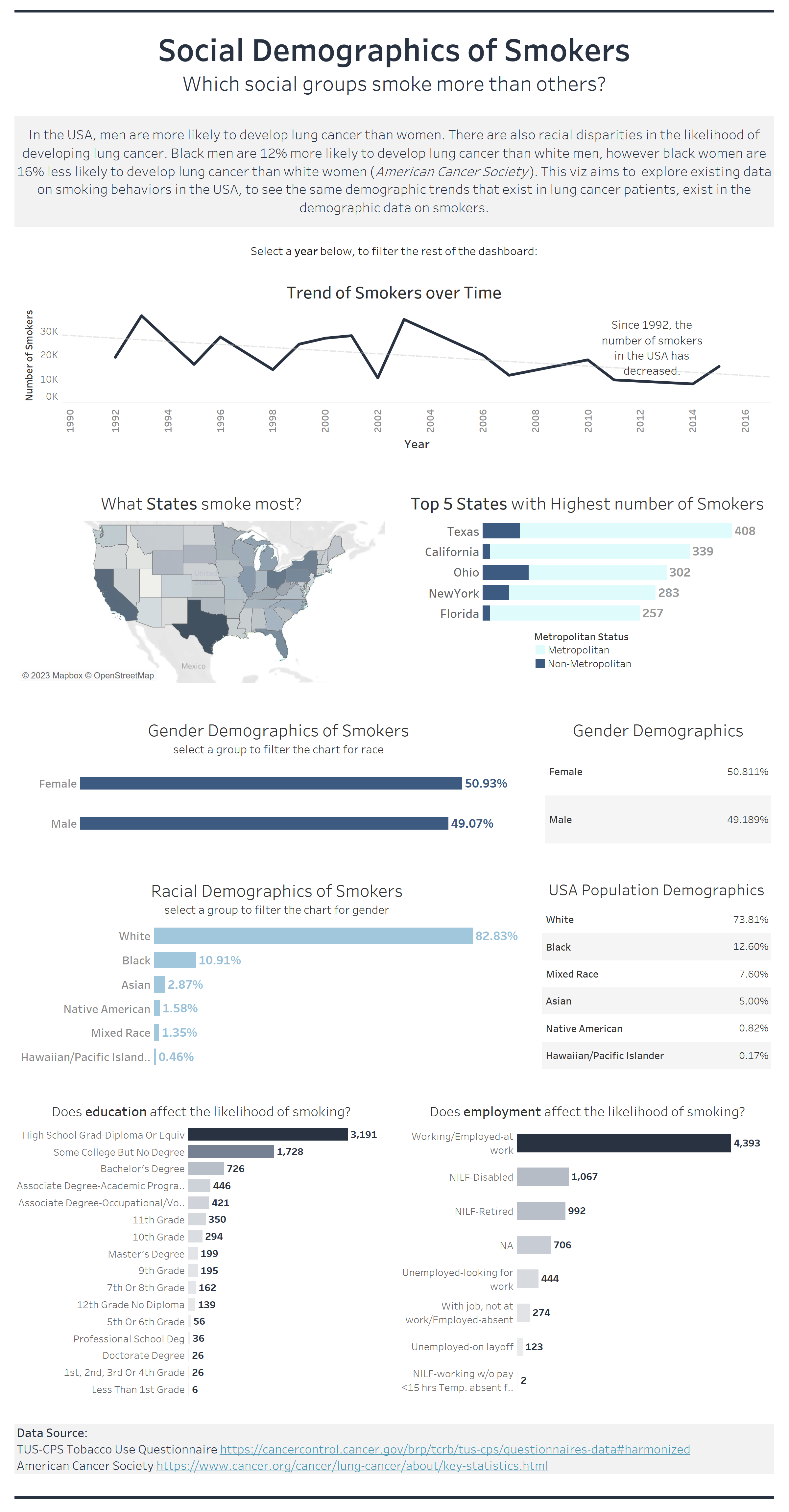 With about an hour to go before the cut-off I got to work building my dashboard. I'd managed to create the template whilst waiting for my data to load through Alteryx, so I didn't have to worry so much about formatting. However, there were several points where I had to go back to the dashboard i.e. Alteryx, to reconfigure some of the fields I had pulled through as they weren't correct. I ended up narrowing the scope of my dashboard, and just trying to create a few charts that would at least tell some of the story I had wanted to tell. In the final half hour I brought in some external demographic data, which ended up not working for most of the years but hey ho, the idea was there. The idea behind this was highlighting the fact that although we may see higher numbers of smokers for certain demographic groups, this may be explained by the fact those groups make up a larger portion of society, so saying they are more likely to smoke would be incorrect.