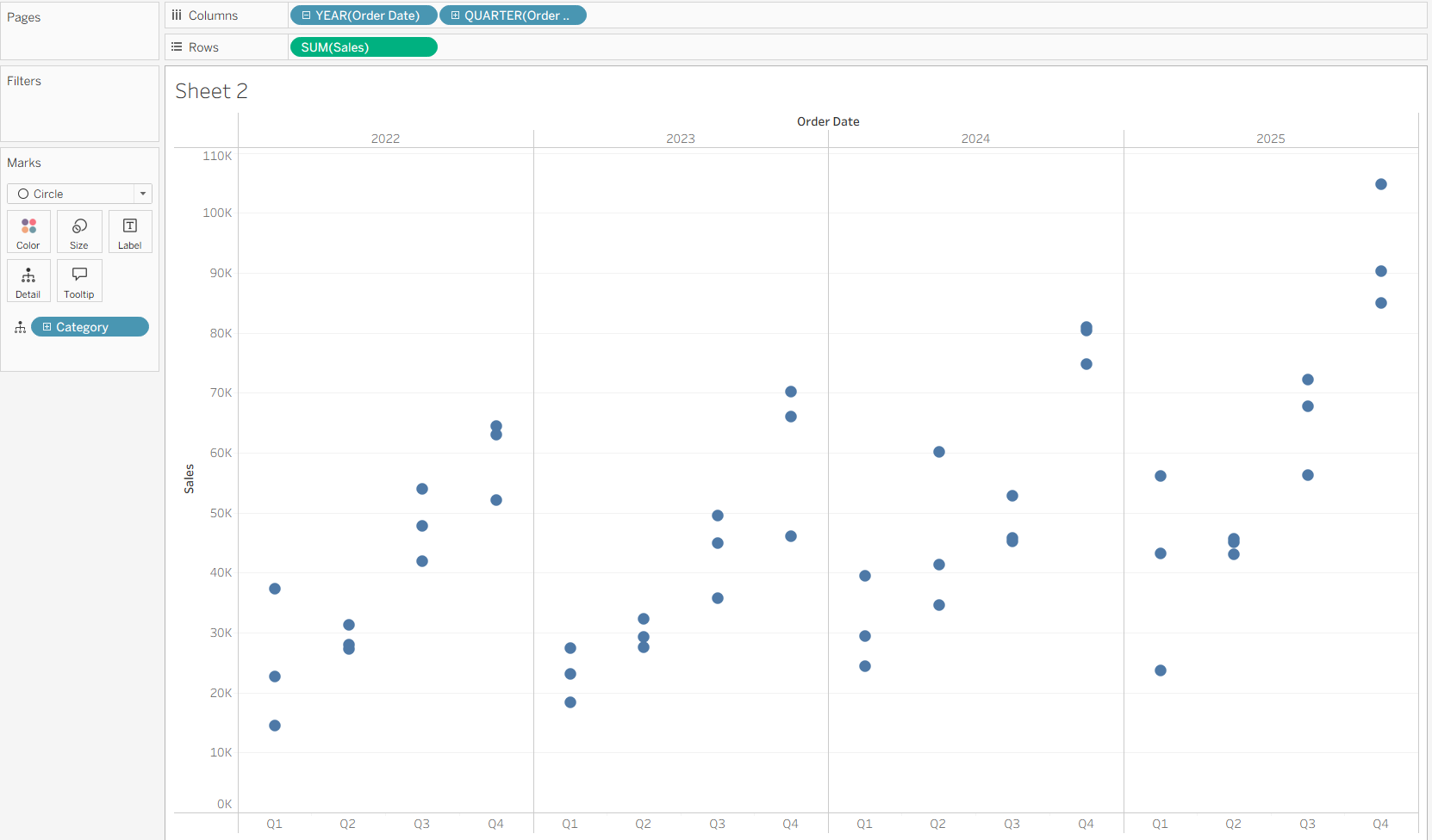 Lets starts off by making a simple chart showing sales by year and quarter and broken down by category.