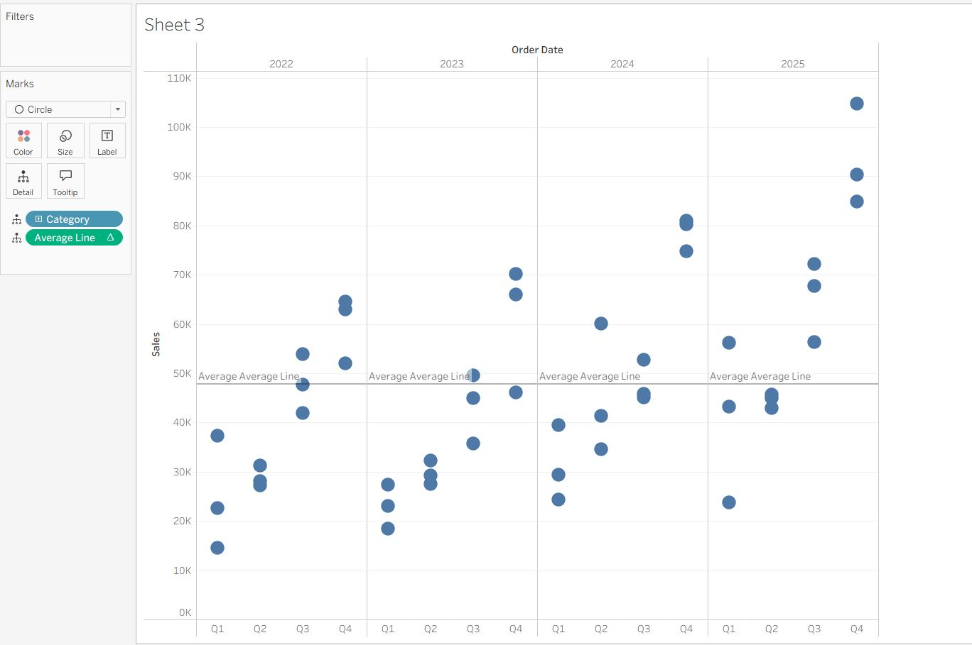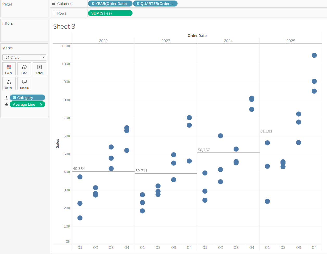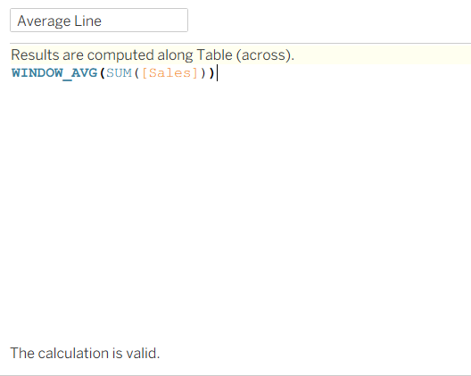 Window calculations allow you to perform an aggregation on an already aggregated calculation. So for this example, we want to find the average of the sum of sales in a period. Since our chart is broken down by year and quarter, we are saying we want the average of the total sales in that year per quarter.