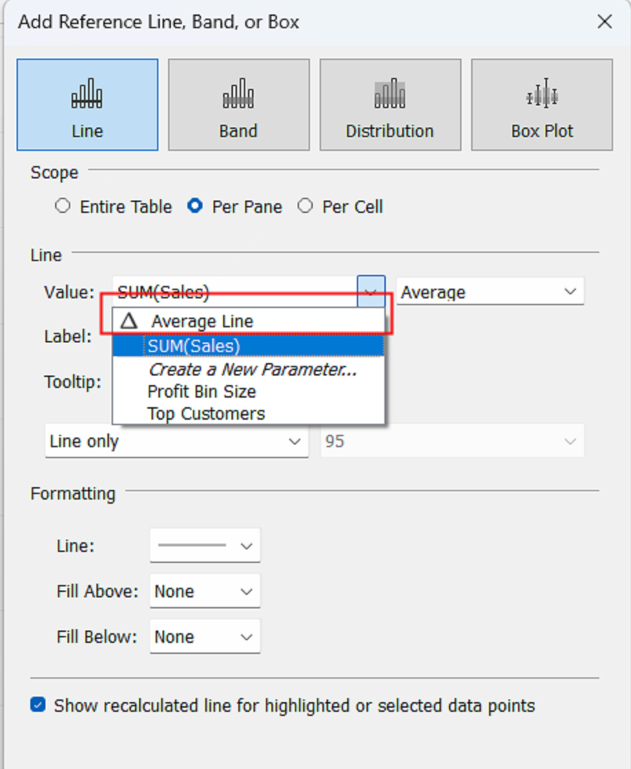 Click "Values" and find your calculated field, I called mine 'average line'. Keep the Aggregation dropdown on average and press OK.