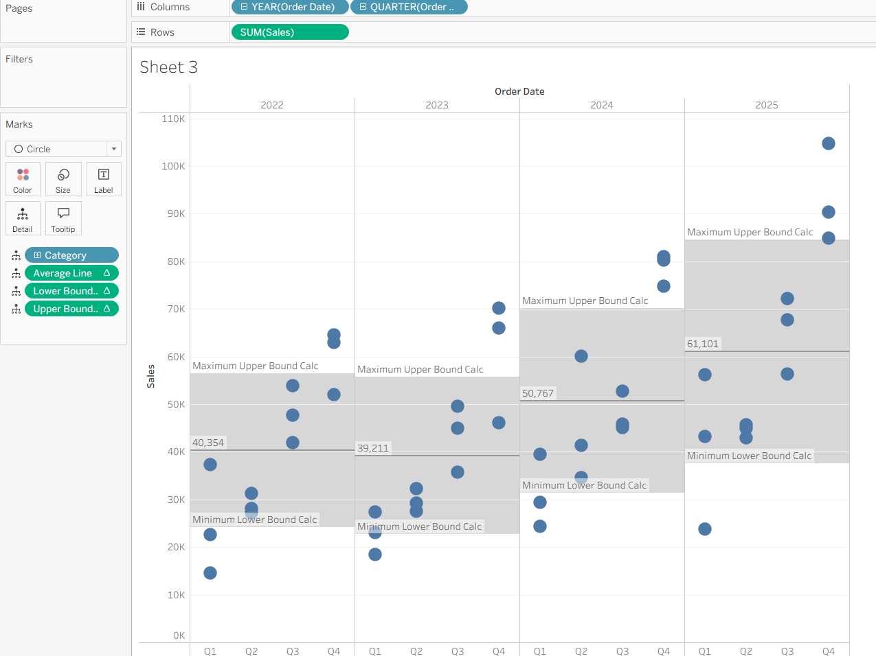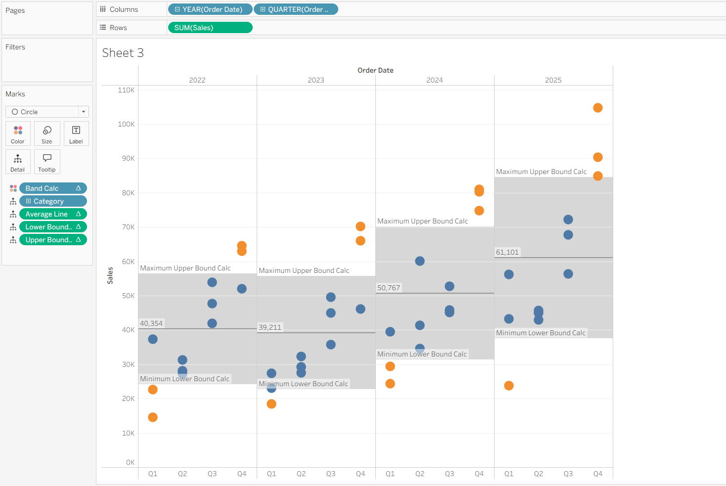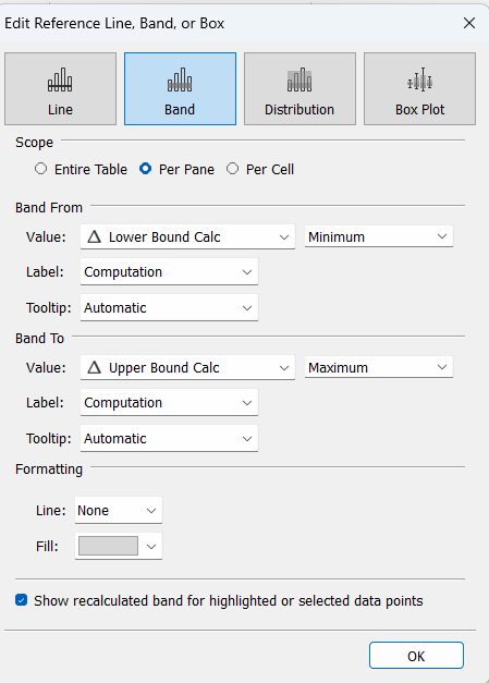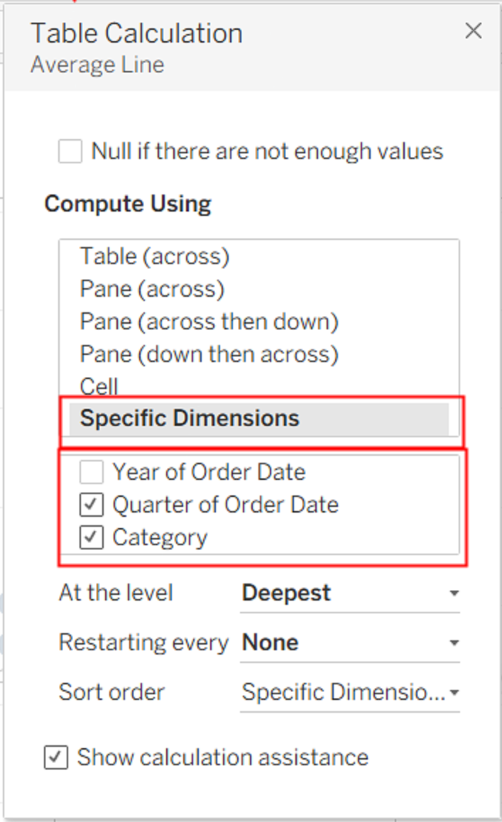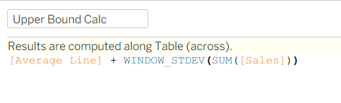 Press ok and then go back to these calcs on detail, click the "lower bound calc" and click "edit table calculation". untick "Year of Order Date". Do these steps again for the "Upper Bound Calc".