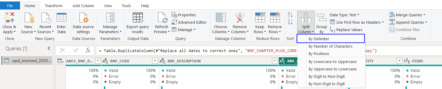 Firstly, highlight the column. Then select "Split Column" in the home page and then "By Delimiter".