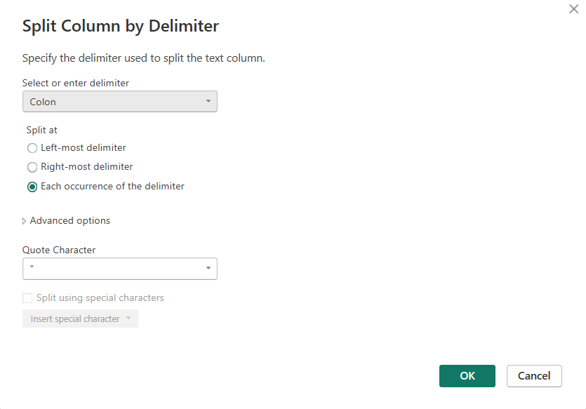 Since there is only 1 delimiter, and, we want to obtain the values on both the left and right side of it, we would use the "Each occurrence of the delimiter".