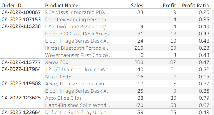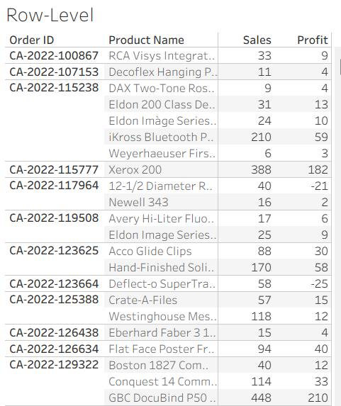 The level of detail of Tableau's Sample Superstore is Order ID, Product-level. Multiple products may be bought within the same order. Making a text-table with Order ID, Product Name, Sales and Profit: