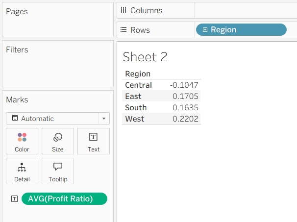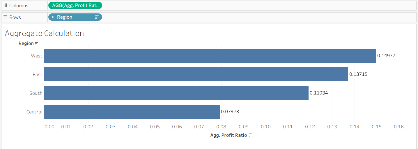 But this isn't what we want. The AVG(Profit Ratio) values being displayed are the averages of the row-level calculations we saw previously, grouped by region. What we want is the total profit divided by the total sales per region, not a regional aggregate of row-level values.