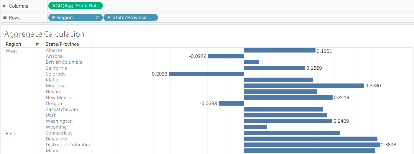 Compare the two images below. In the first, the profit ratio is aggregated at the region-level. In the second, State/Province - a more granular dimension - has been added, and so the calculation is performed at the State/Province-level.