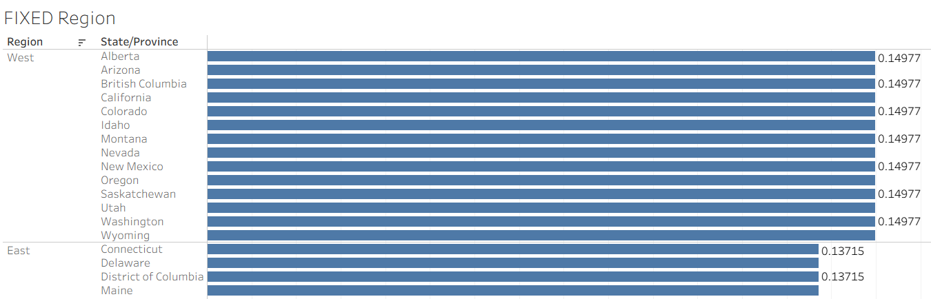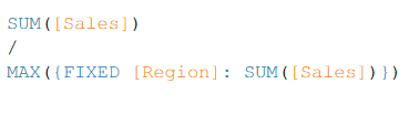 And then we'd need to divide the former by the latter. The first is straightforward. If State/Province is in the view, SUM([Sales]) will be computed at the state-level as is. The second is not. If we use SUM([Sales]) again, we'd only get state-level values again. What we need, instead, is the total Sales for the region, repeated for each state within that region.