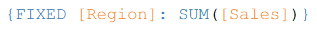 That is, a set of curly braces, the keyword FIXED followed by the dimension(s) that we'd like to fix our calculation to, a colon and an aggregate of the measure we want.
