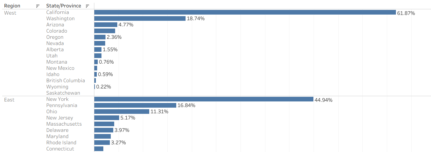 Let's say that we wanted to compute the % or proportion of sales that each State/Province contributes to its Region's total sales. P.S. This can, arguably, be calculated more easily with a table calculation.