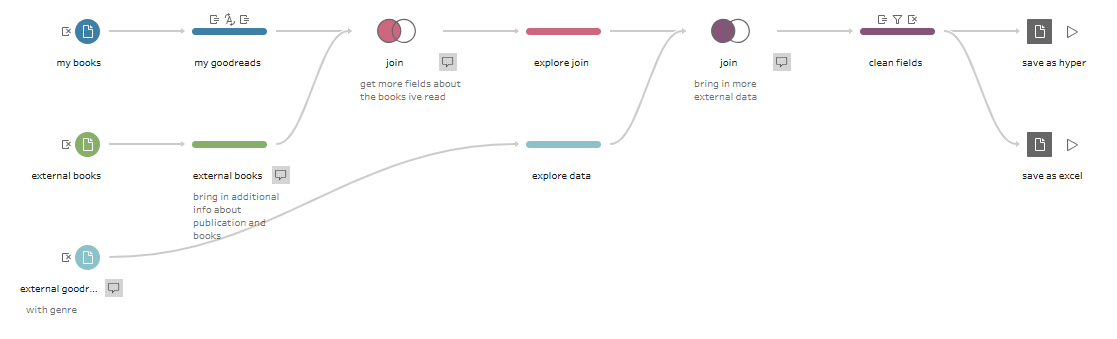 Using Tableau prep I then created a simple flow to join and prepare this data in order to build a dashboard and explore my books more visually.