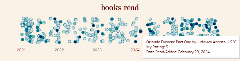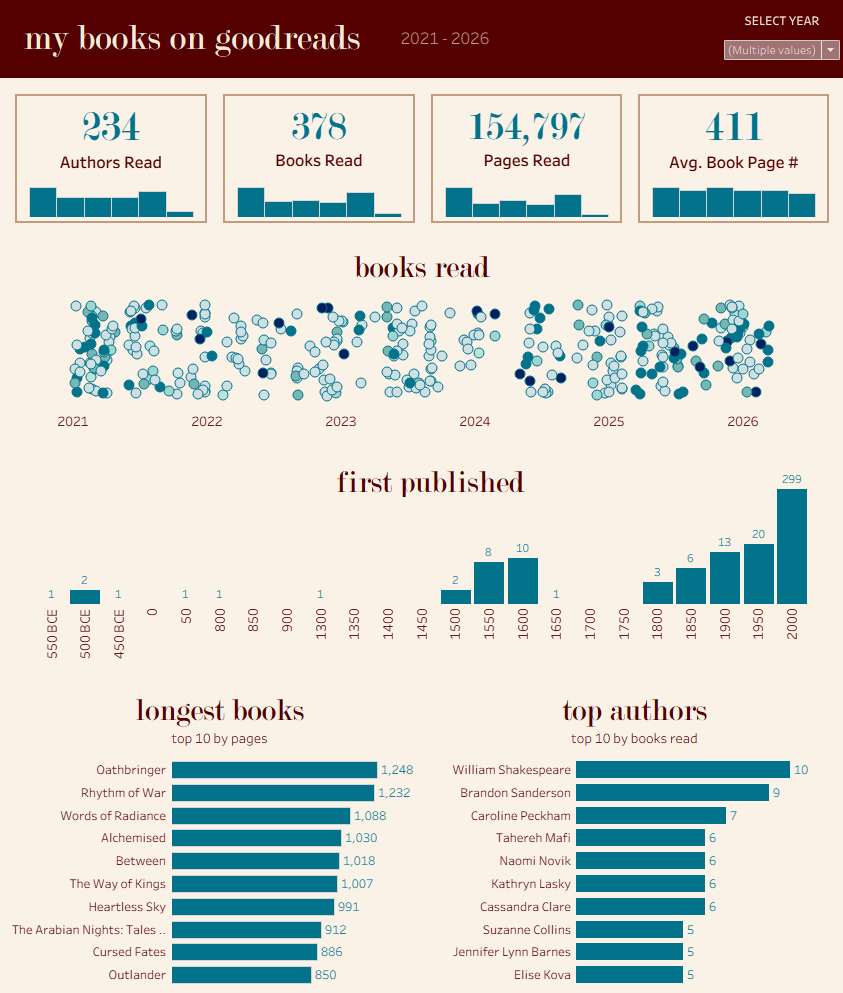 While my final dashboard only features a fraction of the charts I built, the process offered deep insights into my reading habits and how they’ve evolved. In designing the interface, I leaned into a minimalist aesthetic; since this was for personal use, I chose 'curated obscurity' over information density. If I were building this for a wider audience, I’d prioritize clarity and context. For now, however, I’m enjoying the sense of mystery and discovery that an ambiguous dashboard invites.