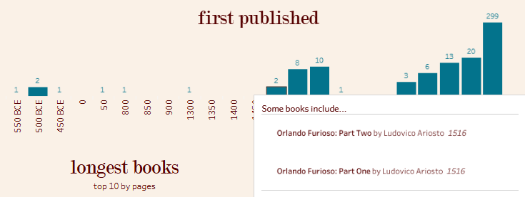 While I only ended up including in my dashboard a few of the many charts I built, I was able to learn so much about what I read and how that has changed over time.