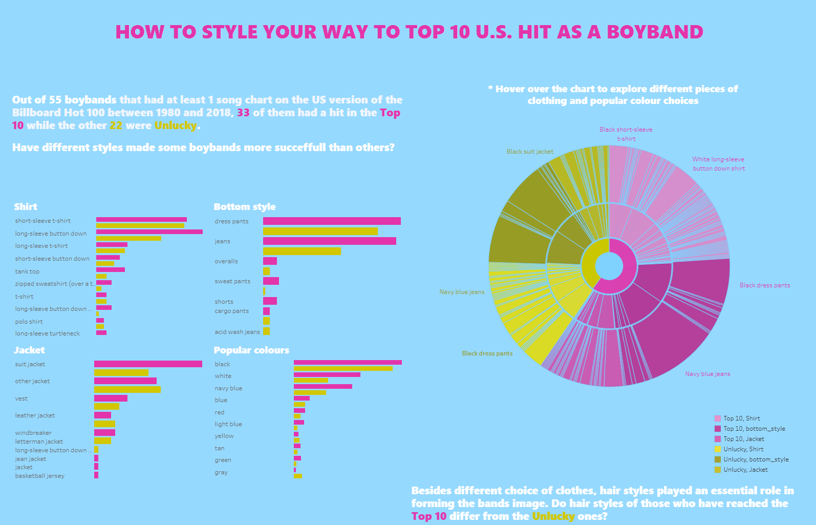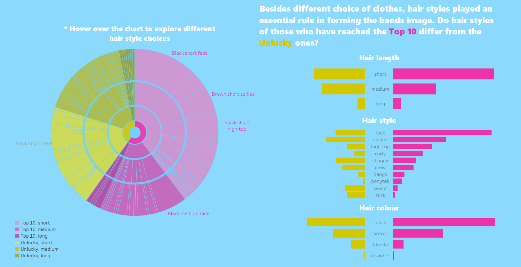 The centrepiece of my dashboard was the sunburst chart, which offered an intuitive way to compare the Top 10 boy bands with the “unlucky ones” in terms of their choice of clothing and hair styles. This chart style allowed me to experiment with a more artistic and infographic-like aesthetic.