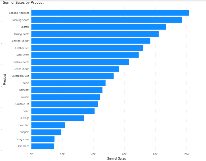 Firstly, lets create the base for our bar chart, which will simply include our products on the Y-axis and our Sum of Sales on the X-axis. With products sorted from most to least sales.