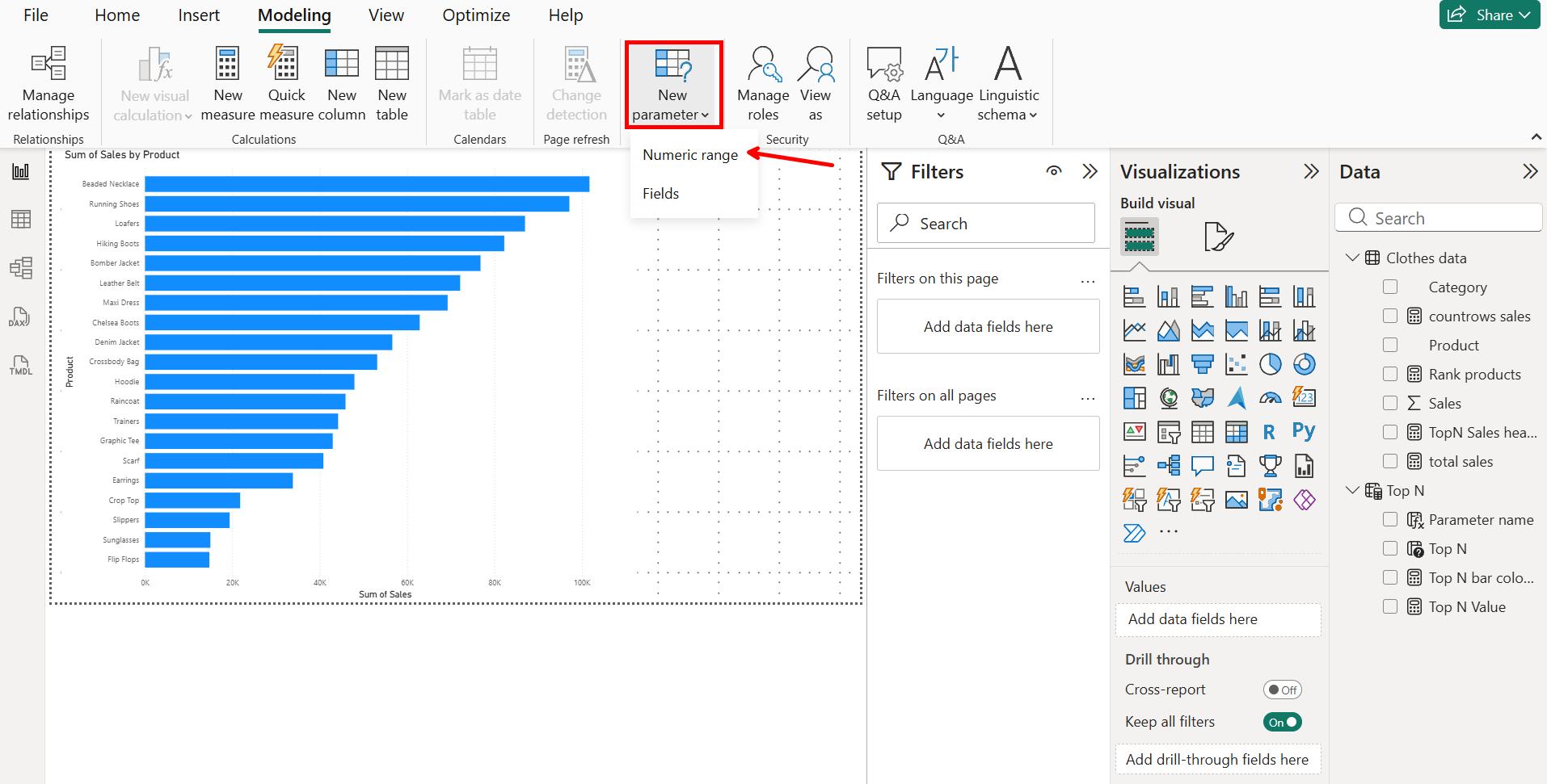Now that we have our bar chart, we need to make our Top N parameter, which we'll use to highlight certain products later on. For this parameter we need to select numeric range.
