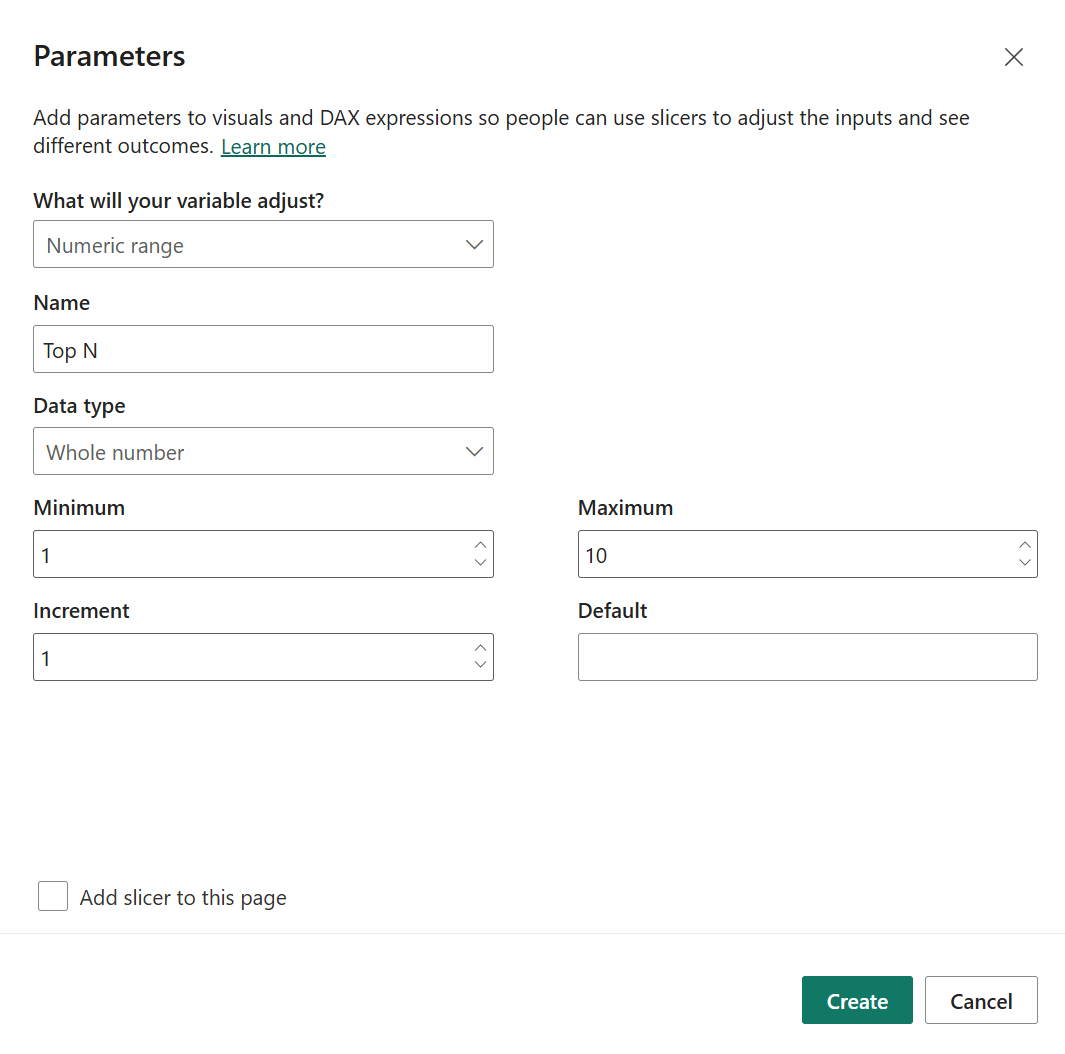 Lets call this parameter Top N and give it a minimum value of 1 and a maximum of 10, going up in increments of 1.