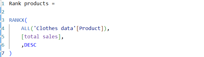 Now that our parameter is set up, we need to start working on creating our Bar colour measure, whereby only the Top N bars will be coloured. To do this we need make a measure for Total sales. After this we can rank our products. This calculation will rank all of our products in terms of total sales with the highest sales total being 1 and each subsequently descending bar after being one number bigger.
