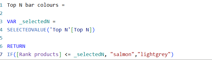 Now that each product has been assigned a rank value we can create our Top N bar colours measure. This measure used VAR which allows you to essentially make measures within a measure, here we created _selectedN which will return the current value within our Top N parameter. RETURN equates to the actual measure you want to create, in this case a measure which will make any product ranked >= to our Top N value salmon coloured while those below stay a light grey.
